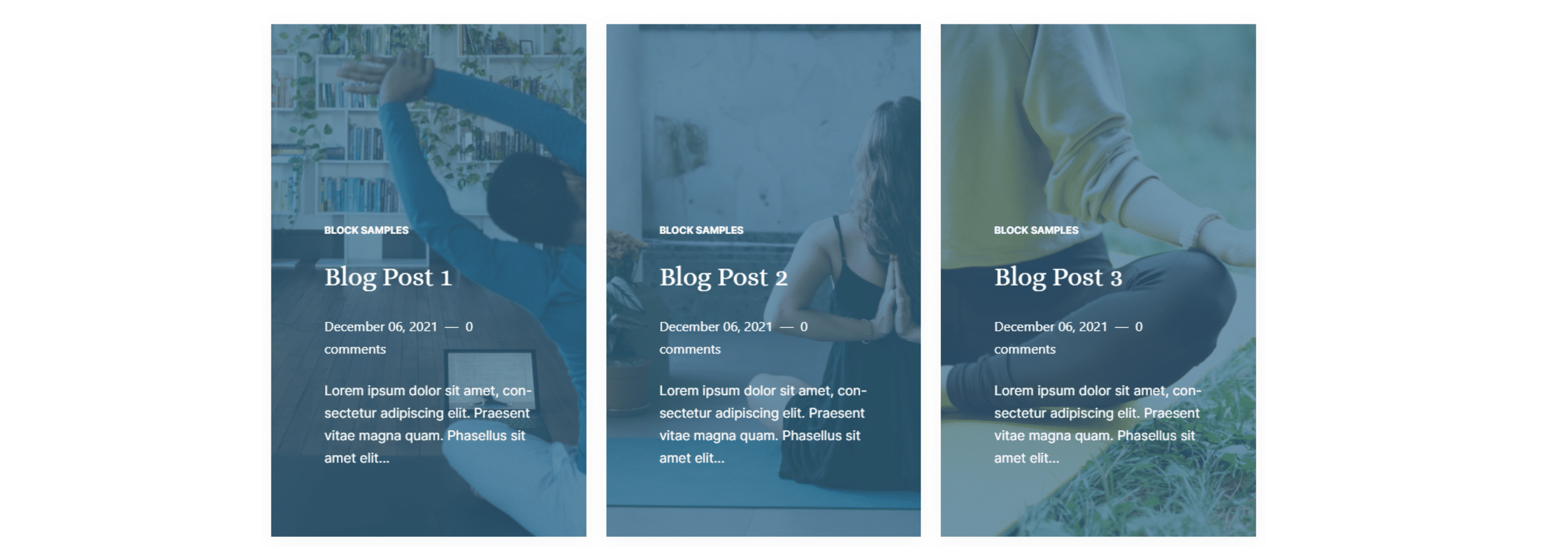Blog post block with a portfolio layout and a blue overlay color on the featured image