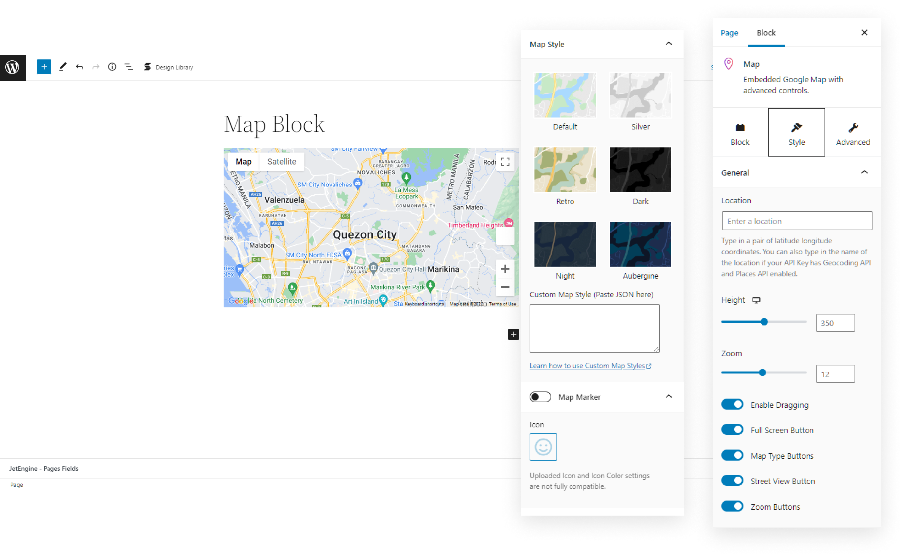 heading & text block followed by a 3-column block with a nested map block, heading, text, and button block